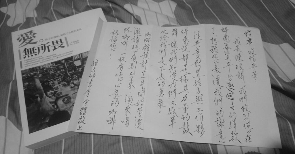 該說巧嗎?這兩天正好整理到幾年前參與黑孩子黑咖啡募資獲得的書,還有書送來時隨附的信,就聽到陳爸離開的消息。