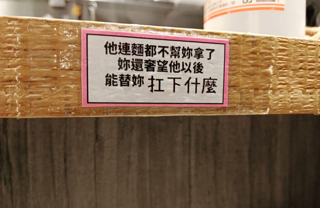 最近去的拉麵店規定同行的男士要幫女士端麵,巧的是麵上來時某先生有電話來,所以是我端的。如果是拿著鐵鎚的我大概會很想戰這句,不過在吃麵時光遇到,就笑笑拍張照就好:)