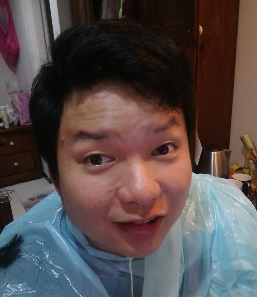 在這之前,我從來沒有剪過別人頭髮的經驗,頂多只有幫自己剪過瀏海。我用的也不是剪頭髮專用的剪刀,就是一般家用的文具剪刀。而且因為太臨時起意,只能用輕便雨衣充當剪髮圍巾接頭髮,整個就是超克難的XDD